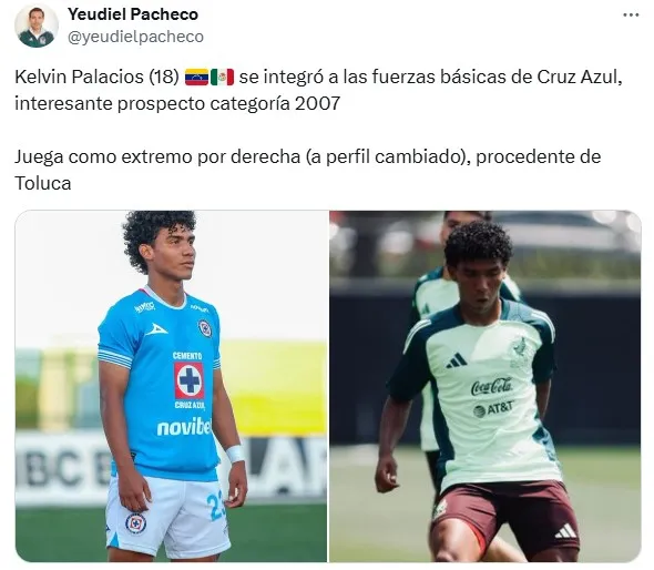 En la misma línea, Yeudiel Pacheco informó que La Máquina incorporó a Kelvin Palacios para la siguiente temporada. El extremo derecho es categoría 2007 y viene de tener un torneo muy interesante en Toluca; además ha sido convocado a la Selección Mexicana Sub-18. Lo curioso es que también cuenta con la nacionalidad venezolana al haber nacido en el estado de Nueva Esparta.