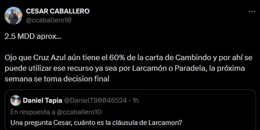 Según el periodista César Caballero, perteneciente a ESPN, el cementero todavía conserva el 60% del delantero campeón de goleo en dos campeonatos, y no sería descabellado que quieran involucrarlo en las negociaciones. “Ojo que Cruz Azul aún tiene el 60% de la carta de Cambindo y por ahí se puede utilizar ese recurso ya sea por Larcamón o Paradela”.