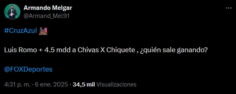 El periodista Armando Melgar agregó en su cuenta de X que Cruz Azul le daría a Chivas 4.5 millones de dólares más la carta de Luis Romo. Vale recordar que hace un semestre el cementero pagó 6MDD por el los servicios del también ex Querétaro. Sin dudas, una novela que parece que tendrá más capítulos.