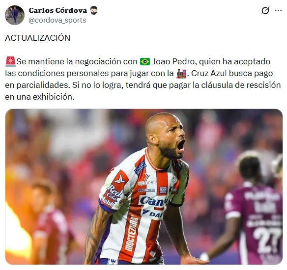 A pesar de este obstáculo, el delantero brasileño ya dio el visto bueno para su llegada. Según el reportero y ex jefe de prensa de La Máquina, Carlos Córdova: “Se mantiene la negociación con Joao Pedro, quien ha aceptado las condiciones personales para jugar con la Máquina. Cruz Azul busca pago en parcialidades. Si no lo logra, tendrá que pagar la cláusula de rescisión en una exhibición”.