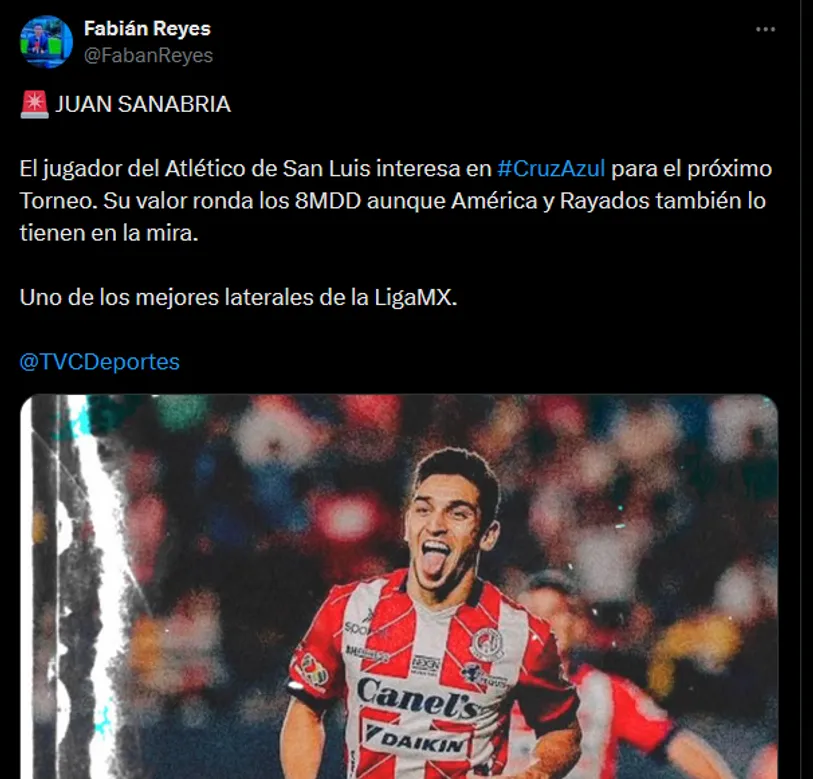 Según los periodistas Fabián Reyes e Iker Carrera, el jugador del cuadro potosino interesa y mucho. “El jugador del Atlético de San Luis interesa en Cruz Azul para el próximo Torneo. Su valor ronda los 8MDD aunque América y Rayados también lo tienen en la mira. Uno de los mejores laterales de la Liga MX”.