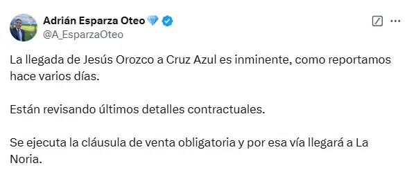 “La llegada de Jesús Orozco a Cruz Azul es inminente, como reportamos hace varios días. Están revisando últimos detalles contractuales. Se ejecuta la cláusula de venta obligatoria y por esa vía llegará a La Noria“, publicó el periodista especializado en el día a día cementero.