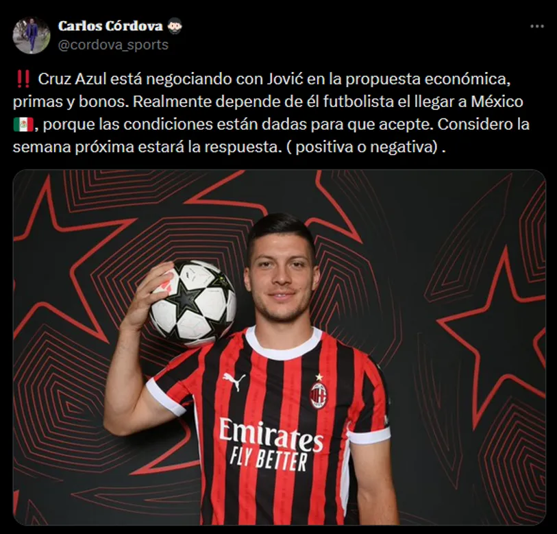 Sobre el tema hablo Carlos Córdova, el jefe de prensa celeste: “Cruz Azul está negociando con Jović en la propuesta económica, primas y bonos. Realmente depende de él futbolista el llegar a México, porque las condiciones están dadas para que acepte. Considero la semana próxima estará la respuesta. (positiva o negativa)”.