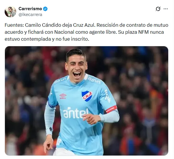 A esa información exclusiva se suma el reporte de Ike Carrera, quien aportó un dato clave sobre la forma en que se dio el desenlace. Según el insider, la salida de Camilo Cándido se habría concretado mediante una rescisión de contrato de mutuo acuerdo, lo que habilita al futbolista a firmar con Nacional de Uruguay como agente libre.