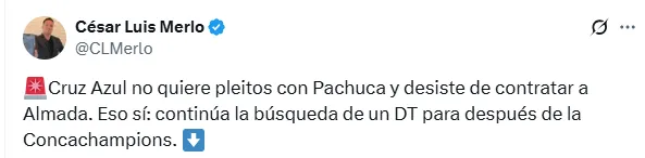 “Súper Deportivo pudo saber que si bien el uruguayo era el entrenador que más consenso generaba en Cruz Azul, el club tomó la decisión de no avanzar por él, ya que no quería entrar en disputas con los Tuzos, por lo que seguirán en búsqueda de nuevo técnico.”, escribió Merlo en el portal Súper Deportivo.
