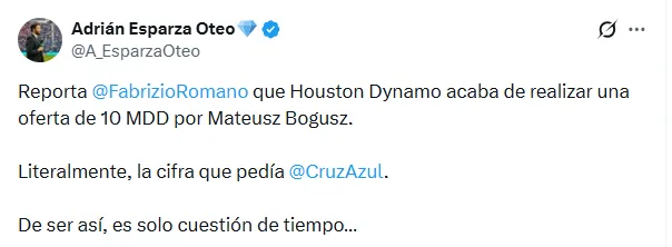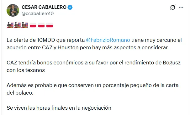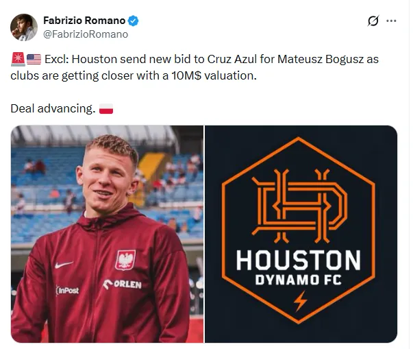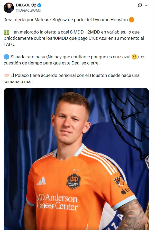 César Caballero, reportero de ESPN, detalló que, además del monto base, Cruz Azul podría recibir bonos adicionales por el rendimiento de Bogusz en Houston Dynamo y conservar un pequeño porcentaje de la carta del polaco. Todo indica que se viven las horas finales de la negociación.