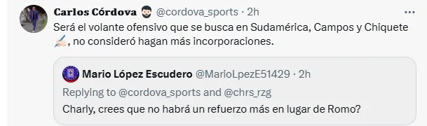 “Charly, ¿crees que no habrá un refuerzo más en lugar de Romo?”, preguntó un usuario de X al periodista. “Será el volante ofensivo que se busca en Sudamérica, Campos y Chiquete. No considero que hagan más contrataciones“, explicó Córdova.