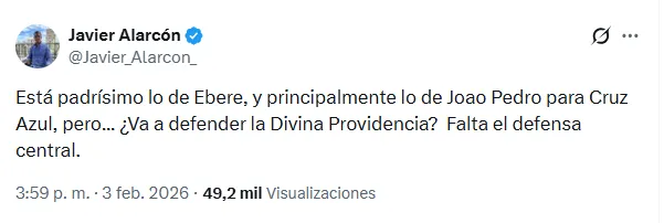 En su cuenta de X escribió: “Está padrísimo lo de Ebere, y principalmente lo de Joao Pedro para Cruz Azul, pero… ¿Va a defender la Divina Providencia? Falta el defensa central“.