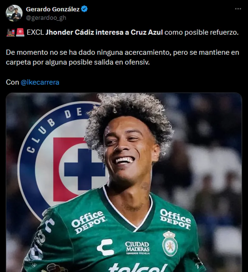 “Jhonder Cádiz interesa a Cruz Azul como posible refuerzo. De momento no se ha dado ninguna acercamiento, pero se mantiene en carpeta por alguna posible salida en ofensiva”, explicó el reportero en su perfil. Sin embargo, otra fuente confiable como lo es Ike Carrera también dio detalles al respecto.