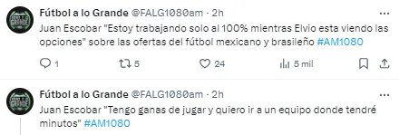 “Tengo ganas de jugar y quiero ir a un equipo donde tendré minutos“, fueron las primeras palabras de Juan Escobar para el programa de radio Fútbol a lo Grande, luego de que se confirmara que rescindió su contrato con Cruz Azul y que quedaría desvinculado por completo del club.