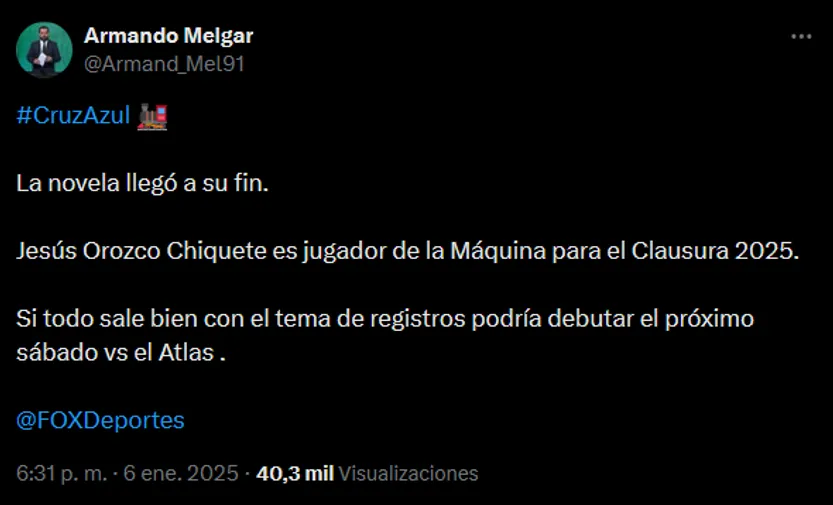 Todavía no hay una fecha confirmada por ninguna fuente, pero sí que Chiquete podría debutar mucho antes de lo previsto. Resulta que el reportero Armando Melgar expresó en la red social X que Orozco tiene chances de debutar ante Atlas, en el debut de Cruz Azul en el Torneo Clausura 2025.