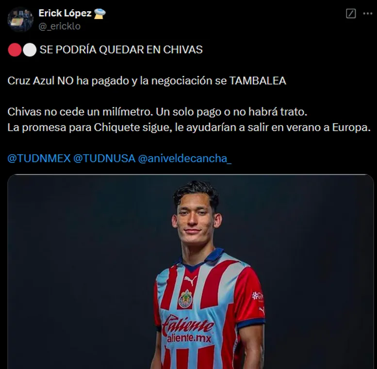 “Chivas no cede un milímetro. Un solo pago o no habrá trato. La promesa para Chiquete sigue, le ayudarían a salir en verano a Europa“, concluye el periodista con la información. Este cierre de año será clave para terminar de dilucidar si esta transferencia se hará, o bien el cuadro de Martín Anselmi busca otras opciones.