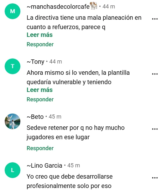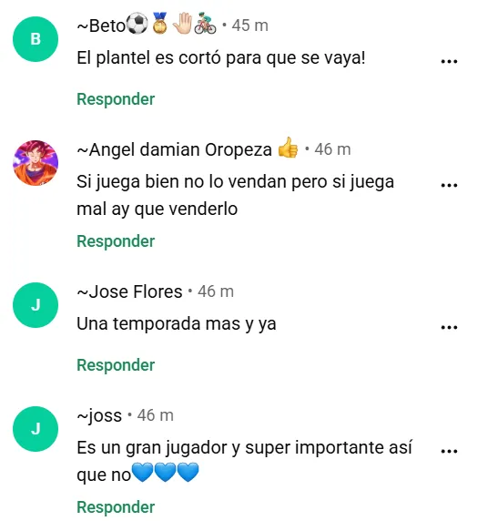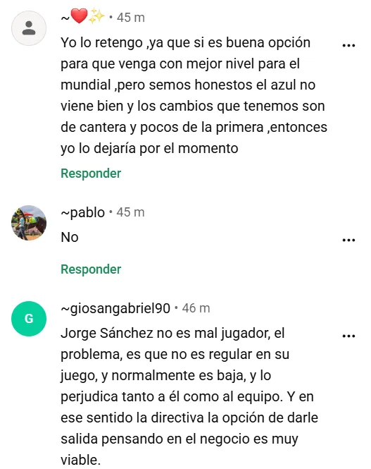 A través de los comentarios habilitados en el canal de WhatsApp de Vamos Azul, aficionados argumentaron sus razones por las que Jorge Sánchez debería quedarse (en su mayoría, aunque algunos pidieron por su salida). “Es buen jugador pero comete muchos errores”, “el Azul no viene bien pero los cambios…” y “se debe retener, no hay muchos en ese lugar”, fueron algunos de los comentarios.