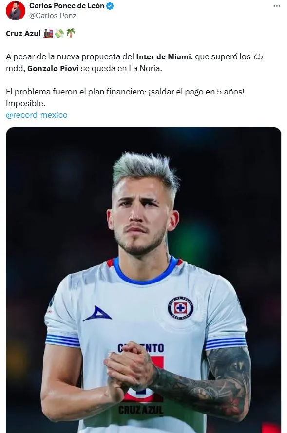 Según informó Carlos Ponce de León, la oferta final de Inter Miami por Gonzalo Piovi superaba los 7.5 millones de dólares, el problema es que pensaba saldar ese dinero hasta verano del 2030. En caso de aceptar esta propuesta, el dinero se habría diluido demasiado a lo largo del tiempo, generando que no sea una negociación positiva. Sobre todo considerando que no existía urgencia por dejar ir al futbolista.
