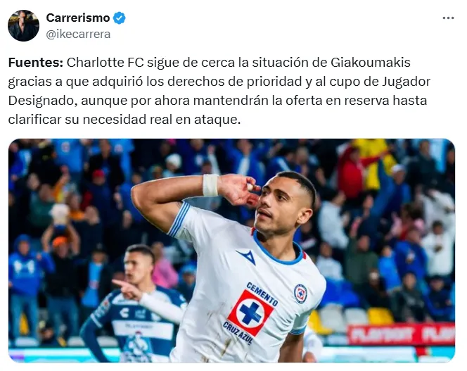 Ahora, su futuro podría estar nuevamente en territorio estadounidense. Según el reportero Ike Carrera, Charlotte FC sigue de cerca la situación de Giakoumakis “gracias a que adquirió los derechos de prioridad sobre el jugador y cuenta con cupo de Jugador Designado“. Esto sería una jugada clave para poder costear su elevado salario, cercano a los 3 millones de dólares anuales.