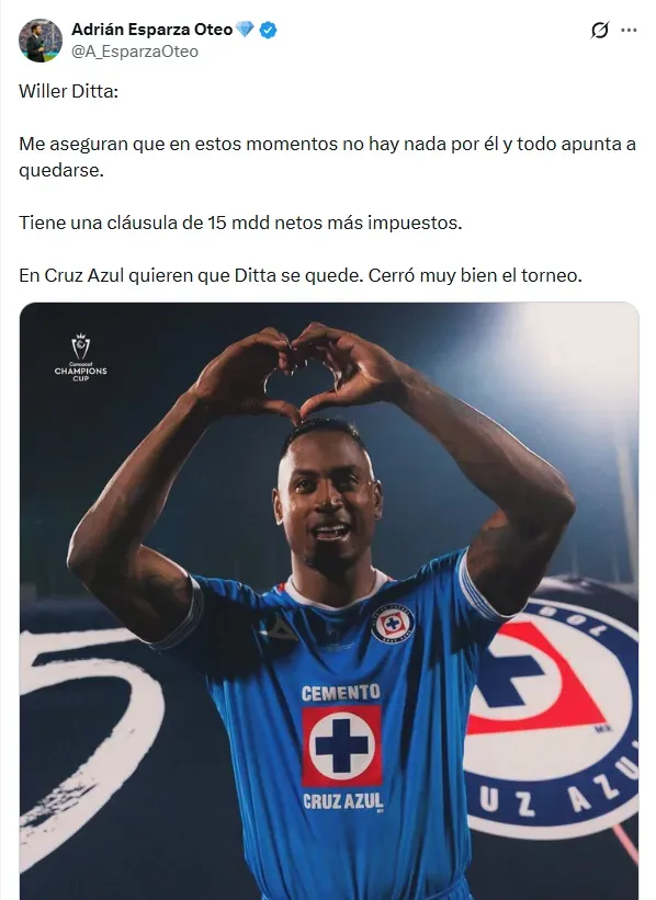 En medio de ese escenario, fuentes como Adrián Esparza han dejado claro que, por ahora, no existe ninguna negociación formal por Ditta. El defensor colombiano solo saldrá del club si se ejecuta su cláusula de rescisión, fijada en 15 millones de dólares. “Me aseguran que en estos momentos no hay nada por él y todo apunta a quedarse. En Cruz Azul quieren que Ditta se quede. Cerró muy bien el torneo”, publicó en su cuenta de X.