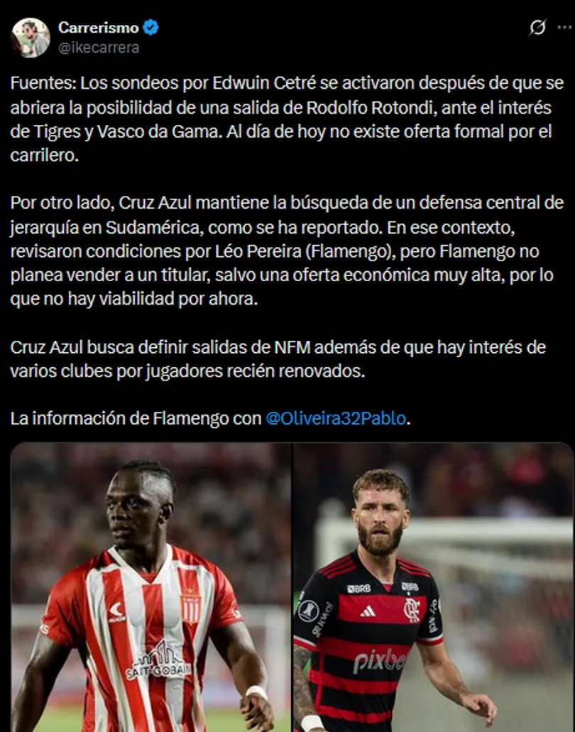 Sobre esto habló el reportero Ike Carrera en sus redes sociales, anticipando que Cetré solo llegaría únicamente si se vende al argentino. “Los sondeos por Edwuin Cetré se activaron después de que se abriera la posibilidad de una salida de Rodolfo Rotondi, ante el interés de Tigres y Vasco da Gama“.