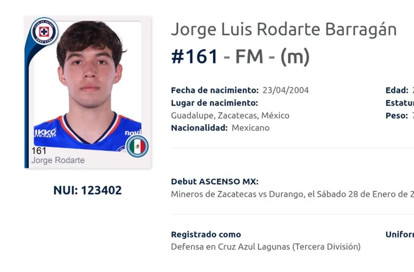 Jorge Luis Rodarte Barragán ya figura como jugador registrado con Cruz Azul, aunque su incorporación no es para el primer equipo ni para las categorías mayores. El zaguero nacido en 2004 aparece vinculado al Cruz Azul Lagunas, equipo que compite en la Tercera División del futbol mexicano. Esto descarta, al menos por ahora, que se trate de un refuerzo inmediato para Larcamón.