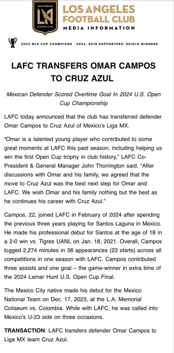 A través de su portal oficial, el conjunto de la MLS le dedicó un extenso mensaje al mexicano de 22 años. “LAFC TRASPASA A OMAR CAMPOS A CRUZ AZUL: El defensor mexicano anotó el gol en tiempo extra en el Campeonato de la Copa U.S. Open 2024″.