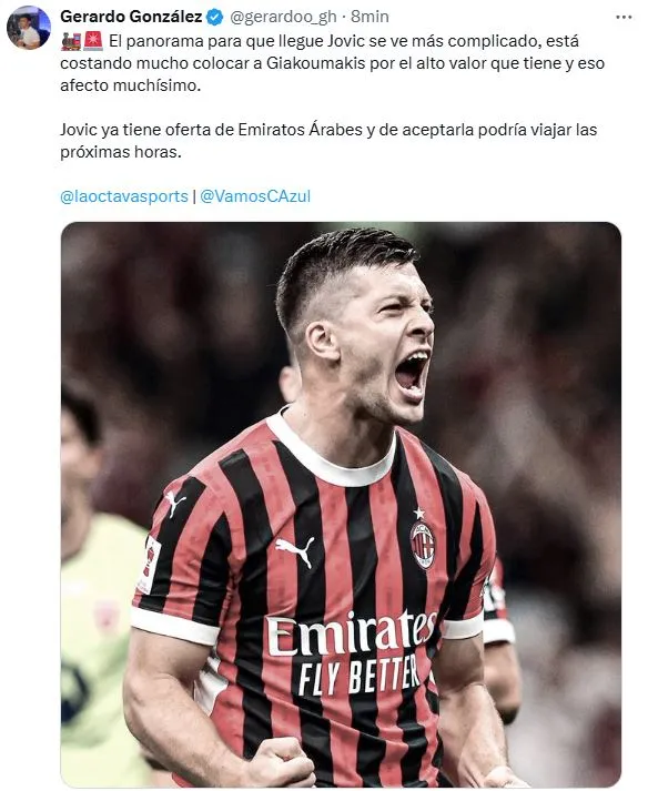 En la misma línea, Gerardo González aseguró que Luka Jovic podría viajar en las próximas horas hacia Oriente al estar interesado en la propuesta. El hecho de que Cruz Azul dilatara la salida de Giorgos Giakoumakis, generó que el serbio dude de su llegada a Ciudad de México. Está claro que en caso de caer su fichaje, el golpe sería muy duro para un Iván Alonso y un Víctor Velázquez que apostaron mucho en su llegada.