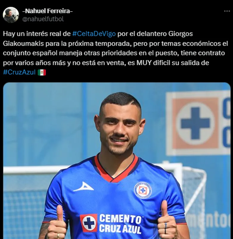 Según pudo revelar el periodista Nahuel Ferreira, Giorgos se quedará en La Máquina: “Por temas económicos el conjunto español (Celta) maneja otras prioridades en el puesto, tiene contrato por varios años más y no está en venta, es muy difícil su salida de Cruz Azul“, expresó en su cuenta de X (ex Twitter).