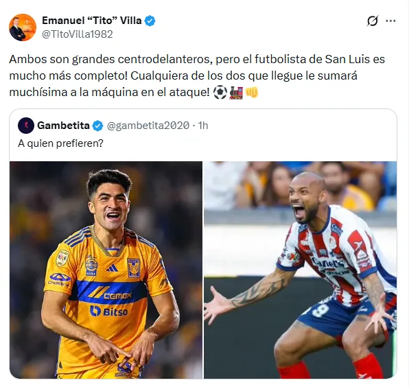 “Ambos son grandes centrodelanteros, pero el futbolista de San Luis es mucho más completo! Cualquiera de los dos que llegue le sumará muchísima a la máquina en el ataque!”, expresó el ex delantero, reavivando la conversación entre la afición.