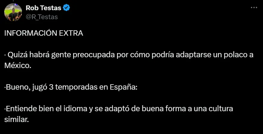 De acuerdo con información de Rob Testas, comentarista de Caliente TV y quien ha seguido de cerca su carrera, el seleccionado polaco no solo entendería “bien” el idioma que se habla en México, sino que además se habría adaptado a la cultura española, similar en muchos sentidos a la del país azteca.