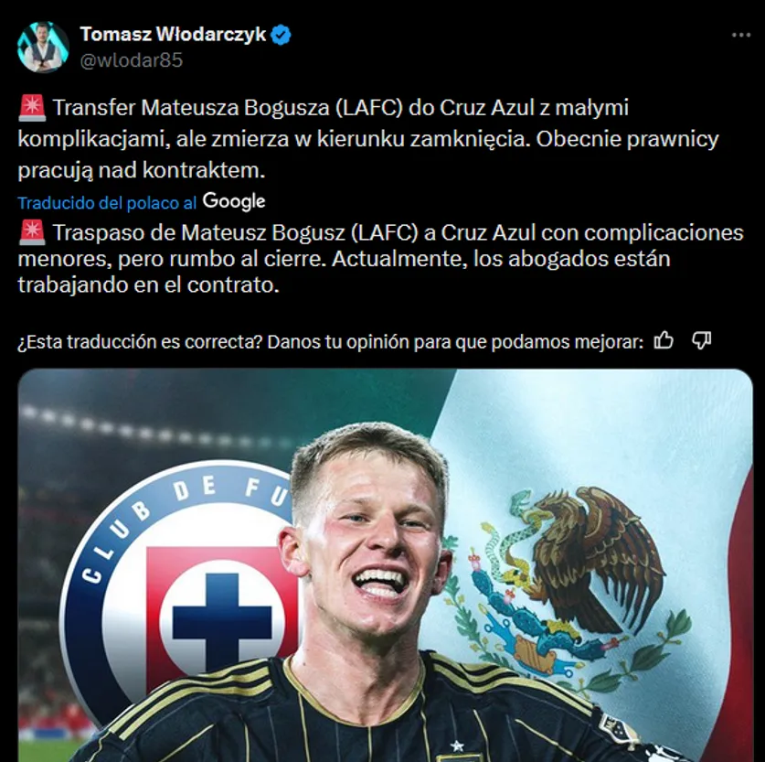 El periodista polaco Tomasz Włodarczyk reveló que La Máquina insiste para convencer a Bogusz de llegar al equipo, con la salida de Anselmi incluida. “Traspaso de Mateusz Bogusz (LAFC) a Cruz Azul con complicaciones menores, pero rumbo al cierre. Actualmente, los abogados están trabajando en el contrato”. Se define la novela.