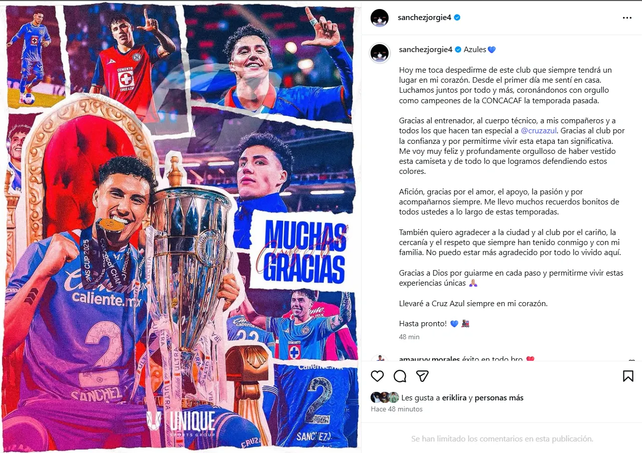 Por su parte, Jorge Sánchez se tomó un momento para expresar su gratitud con un emotivo mensaje dirigido a todo el club y a la afición cementera. Durante su estancia en La Noria, se consolidó como pieza titular clave en la obtención de la Concachampions 2025. Aunque no logró levantar el título de Liga MX, dejó una marca significativa en el equipo.