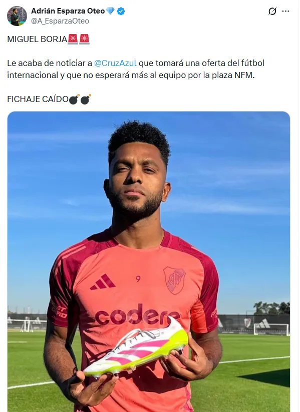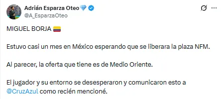 No obstante, la situación dio un giro inesperado este jueves 22 de enero, cuando Adrián Esparza compartió en su cuenta de X que Borja notificó al club que tomará una oferta del fútbol internacional y que no esperará más por la plaza NFM. “Fichaje caído”, cerró, confirmando lo que hasta hace horas era una incertidumbre.