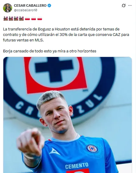 Por su parte, Caballero precisó que la transferencia de Mateusz Bogusz a Houston aún está detenida por temas contractuales y por cómo se utilizará el 30% de la carta que conserva Cruz Azul para futuras ventas en la MLS, lo que terminó de complicar la llegada de Borja.