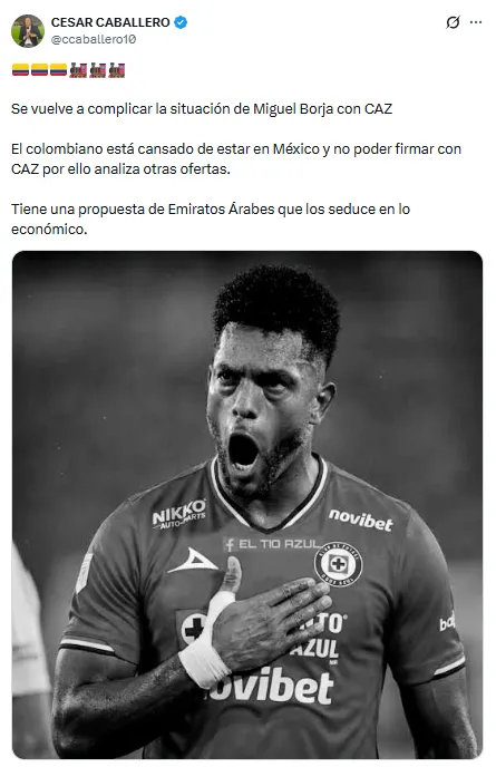 Los últimos reportes de la prensa revelan que Miguel Borja no solo decidió no esperar más por Cruz Azul, sino que ya analiza seriamente una oferta proveniente de Medio Oriente. Según César Caballero, el delantero colombiano está “cansado de estar en México y no poder firmar con La Máquina”, y la propuesta económica de Emiratos Árabes resulta muy atractiva para él y su entorno.