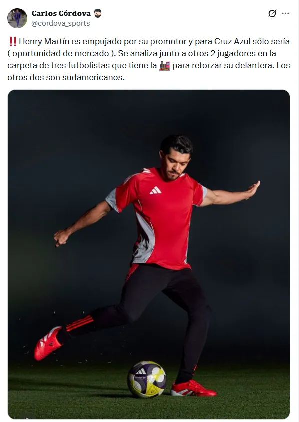 En ese contexto, Carlos Córdova, ex jefe de prensa de Cruz Azul y voz habitual en la interna del club, publicó un mensaje que rápidamente llamó la atención del mundo celeste. En su posteo aseguró que Henry Martín es empujado por su promotor y que, para Cruz Azul, solo representaría una “oportunidad de mercado”.