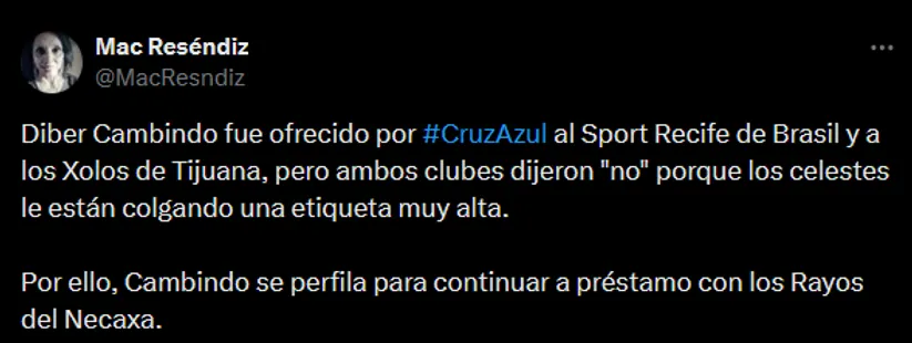 Sin embargo, esto no va a ocurrir: “Diber Cambindo fue ofrecido por Cruz Azul al Sport Recife de Brasil y a los Xolos de Tijuana, pero ambos clubes dijeron “no” porque los celestes le están colgando una etiqueta muy alta“. Sin dar cifras, la misma no debe ser muy lejana a esos 4.5MDD que le exigían a los Rayos.