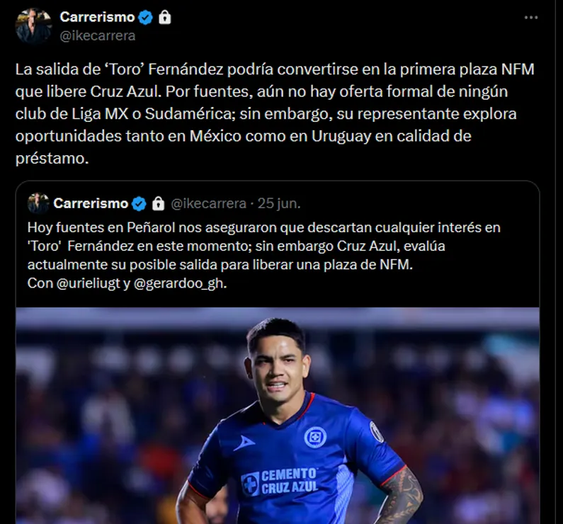 “La salida de ‘Toro’ Fernández podría convertirse en la primera plaza NFM que libere Cruz Azul. Por fuentes, aún no hay oferta formal de ningún club de Liga MX o Sudamérica; sin embargo, su representante explora oportunidades tanto en México como en Uruguay en calidad de préstamo”, expresó la fuente citada.