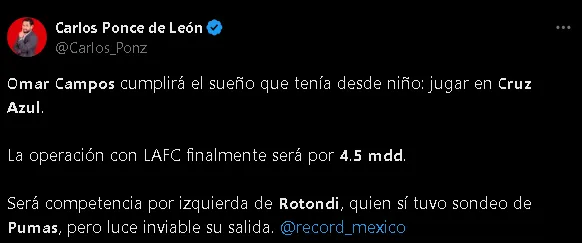 “𝗢𝗺𝗮𝗿 𝗖𝗮𝗺𝗽𝗼𝘀 cumplirá el sueño que tenía desde niño: jugar en 𝗖𝗿𝘂𝘇 𝗔𝘇𝘂𝗹”, lanzó Carlos Ponce, director del diario Récord, compartiendo la imagen en la que se le puede ver al también seleccionado nacional como cementero desde hace ya algunos años.
