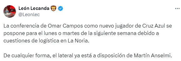 De acuerdo con información de León Lecanda de ESPN, la conferencia de prensa en la que se hará oficial la incorporación de Omar Campos como refuerzo de Cruz Azul se pospuso para el lunes o martes de la próxima semana. El motivo apunta a temas logísticos en La Noria.