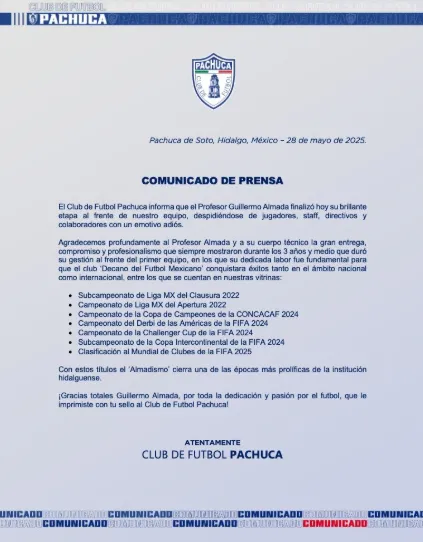 “El Club de Futbol Pachuca informa que el profesor Guillermo Almada finalizó hoy su brillante etapa al frente de nuestro equipo, despidiéndose de jugadores, staff, directivos y colaboradores con un emotivo adiós”, se lee en la primera parte del comunicado que publicó el cuadro hidalguense.