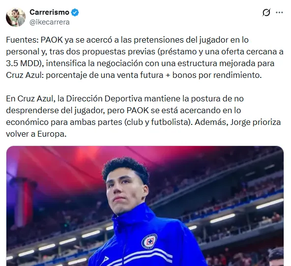 El club griego ya se habría acercado a las pretensiones del jugador y, tras dos intentos fallidos, intensifica las negociaciones con una propuesta mejorada para Cruz Azul, que incluiría un porcentaje de una futura venta más bonos por rendimiento. Un formato que busca compensar una cifra fija que, hasta ahora, no alcanzaba las expectativas celestes.