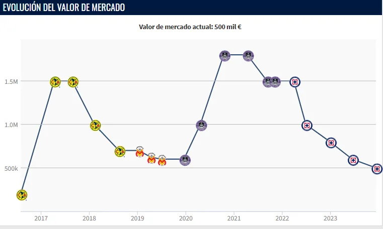 Esta merma en el rendimiento y la participación jaló hacia abajo su valor de mercado. Tras haber sido comprado en 2 millones, el actual precio de su ficha es de 500 mil dólares de acuerdo con el sitio especializado Transfermarkt.