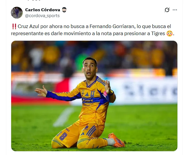 Sin embargo, una de las voces más respetadas del entorno cementero salió rápidamente a poner paños fríos. Carlos Córdova, quien fuera jefe de prensa de Cruz Azul y mantiene cercanía, desestimó por completo el escenario que los vinculaba: “Cruz Azul por ahora no busca a Fernando Gorriaran, lo que busca el representante es darle movimiento a la nota para presionar a Tigres”.