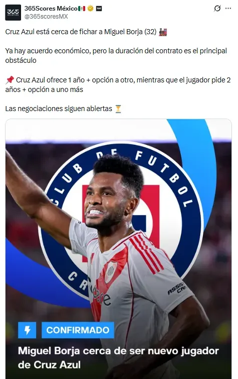 A esto se suma un punto fino que reveló 365 Scores México y aparece como principal obstáculo de momento. De acuerdo con esa información, existiría un acuerdo económico entre Cruz Azul y Miguel Borja, pero las diferencias se centrarían en la duración del contrato. Mientras la directiva celeste -aseguran- propone un vínculo por un año con opción a extenderlo por otro, el delantero colombiano pretendería dos años fijos más una opción adicional, una postura lógica considerando su edad, su estatus como agente libre y el interés de otros clubes de la Liga MX.