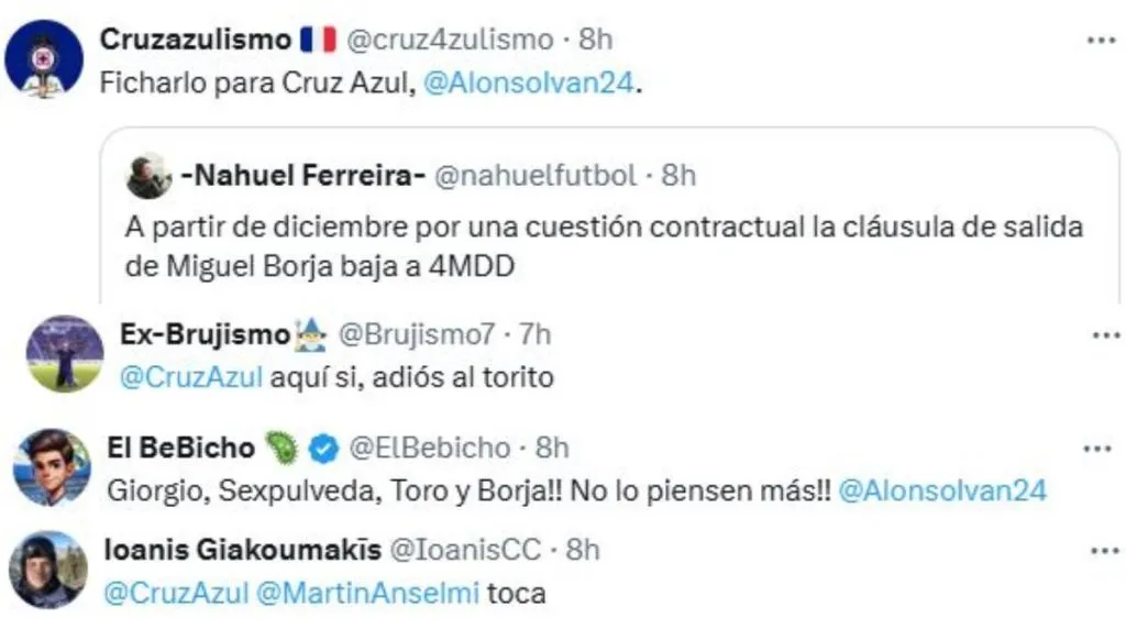 Un jugador que siempre estuvo en la mira de Cruz Azul es Miguel Borja, delantero colombiano que se destaca con la playera de River. Se confirmó que su cláusula de rescisión es de 4 millones de dólares y que su intención sería dejar Argentina al no tener protagonismo con Marcelo Gallardo. El atacante de 31 años lleva 30 goles en 43 partidos y da la sensación de que podría convertirse en el mejor jugador de la Liga MX.