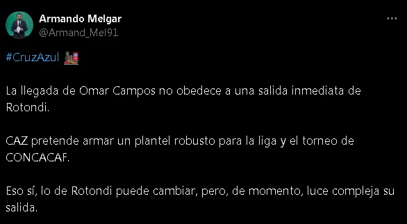 “La llegada de Omar Campos no obedece a una salida inmediata de Rotondi. Cruz Azul pretende armar un plantel robusto para la liga y el torneo de CONCACAF. Eso sí, lo de Rotondi puede cambiar, pero, de momento, luce compleja su salida“, sentenció.