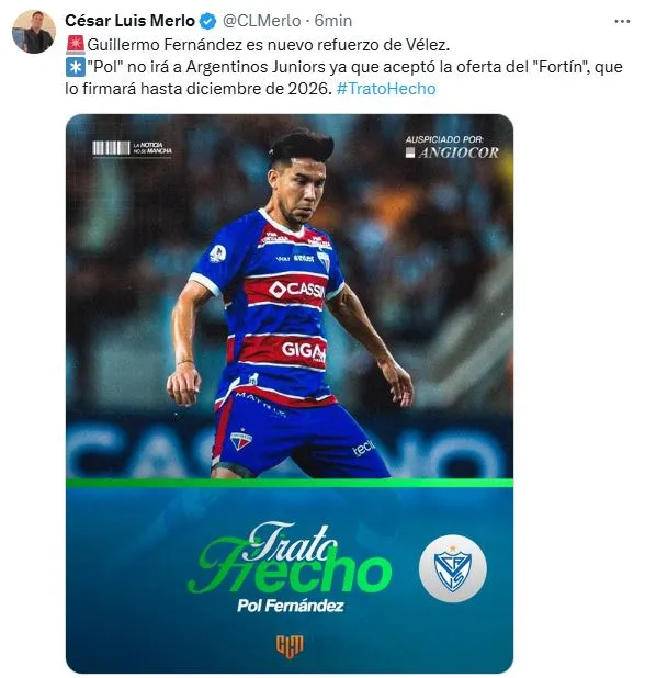Según informó César Luis Merlo, Pol Fernández aceptó la oferta para convertirse en nuevo jugador de Vélez. Si bien el ex cementero también tenía una propuesta de Argentinos Juniors, se inclinó por la del conjunto de Linier por la presencia de Guillermo Barros Schelotto . Y es que la mejor versión de su carrera la mostró cuando el Mellizo todavía era entrenador de Boca.