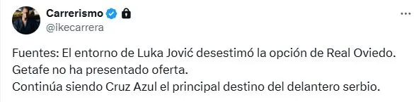 El Real Oviedo consiguió el ascenso a primera división y quiere reforzarse con jerarquía para lograr la permanencia en La Liga. Aún así, Ike Carrera informó que Luka Jovic habría desestimado la posibilidad de jugar en el club de Grupo Pachuca. Por otro lado, el Getafe todavía no realizó una propuesta formal, por lo que tampoco pondría en peligro su llegada a Ciudad de México.