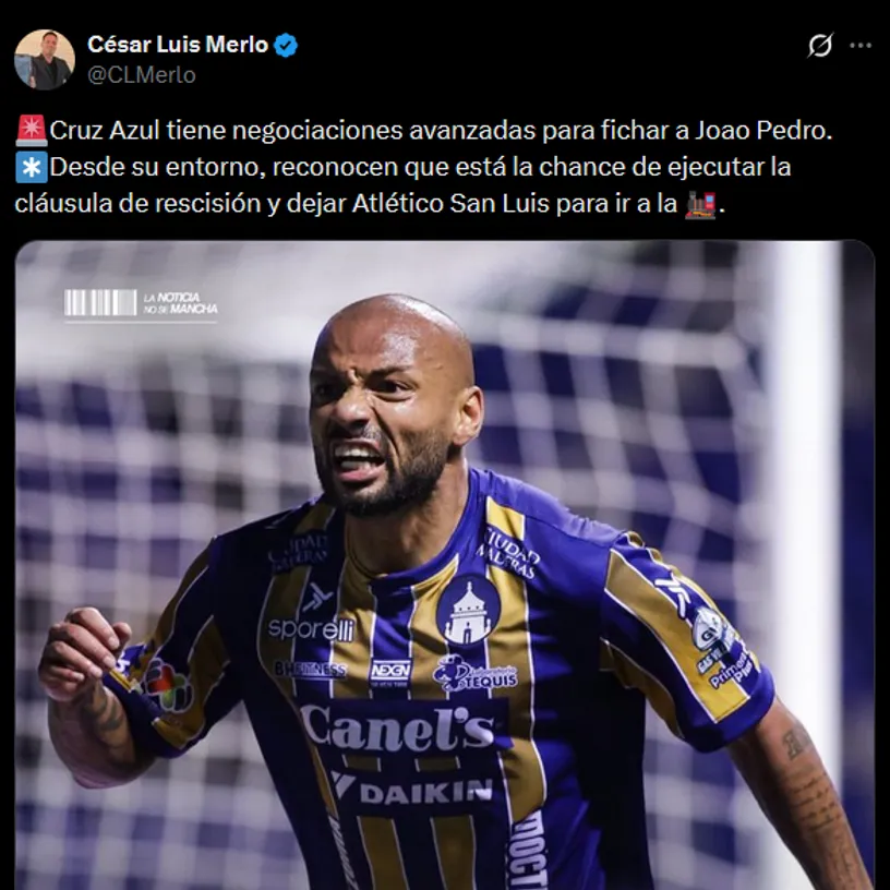 El mercado de pases en la Noria ha dado un giro inesperado con una noticia que sacude la Liga MX. Según informó César Luis Merlo, Cruz Azul tiene negociaciones avanzadas para fichar a Joao Pedro: “Desde su entorno, reconocen que está la chance de ejecutar la cláusula de rescisión y dejar Atlético San Luis para ir a la Máquina“, detalló el periodista.