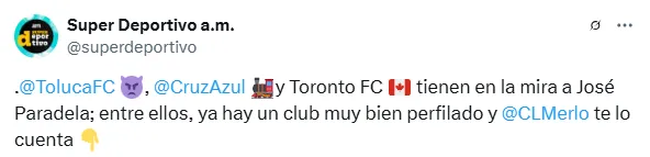 “Súper Deportivo pudo saber que Cruz Azul y Toluca, además del Toronto FC, pujan por hacerse de los servicios del mediocentro argentino. Recientemente, la directiva firmó un nuevo contrato con Paradela, con un vínculo que termina el 31 de diciembre del 2027 y una cláusula de salida de 10 millones de dólares.“, se lee en una información escrita por Merlo.