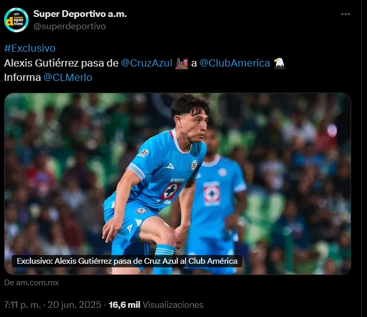 “El mediocampista mexicano Alexis Gutiérrez, que jugó en el Clausura 2025 en Cruz Azul, pasará a las Águilas del América. (…) Súper Deportivo pudo saber que Club América pagó cinco millones de dólares por Alexis Gutiérrez y llegará al cuadro azulcrema a partir del Apertura 2025″, se explicó en dicho portal.