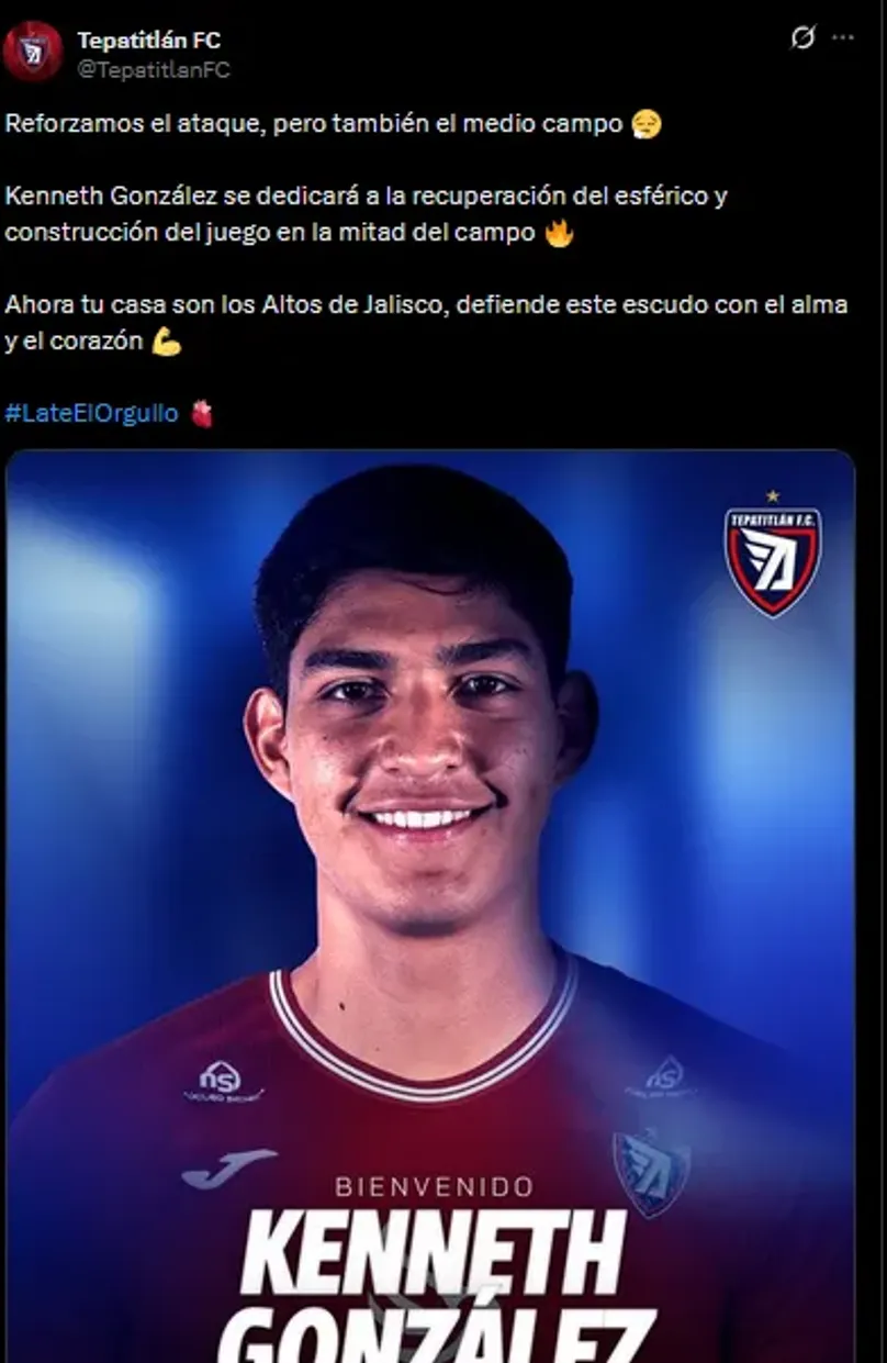 Pero ahora fue el turno de Kenneth González, volante prometedor de la Sub-21. “Reforzamos el ataque, pero también el medio campo. Kenneth González se dedicará a la recuperación del esférico y construcción del juego en la mitad del campo. Ahora tu casa son los Altos de Jalisco, defiende este escudo con el alma y el corazón”, reveló Tepatitlán en todas sus redes sociales.